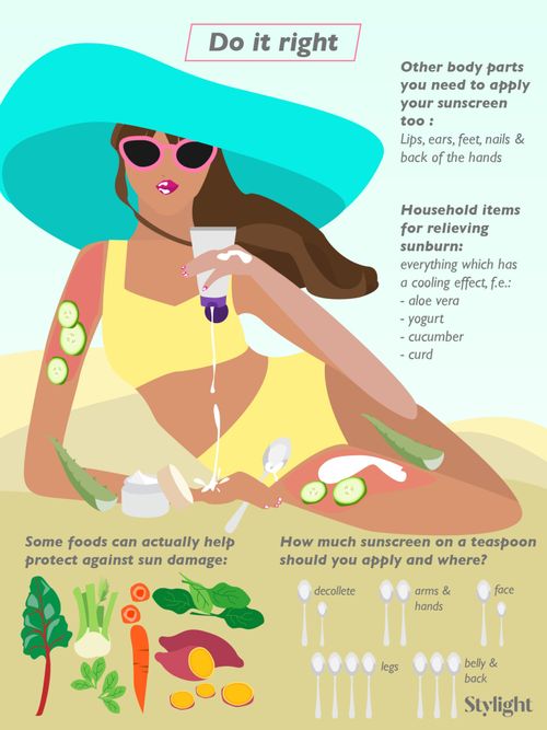For your face, neck, shoulder, and cleavage areas, aim for around 1-2 teaspoons of sunscreen. Arms and hands require around 2 teaspoons and roughly 4-5 teaspoons for your legs. Your stomach and back need 3-4 teaspoons, and don’t forget your ears and feet! Nobody wants to squeeze bright red toes into socks and shoes.