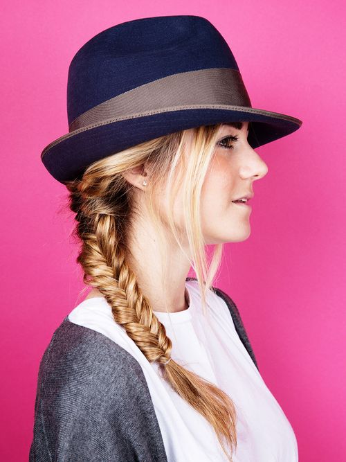 The fishtail plait - this style is perfect for keeping hair smooth under a hat. Pull hair to one side and fish tail it to the bottom. Here's how.