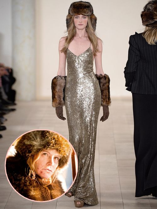Fur has been a defining trend in recent seasons, which gave us plenty to choose from for Daisy Domergue whose fur hat and coat spurred our own pelt purchases this past winter. Would she wear Libertine’s fur fake nails? Or maybe Yiqing Yin full on fur gown? Maybe. But when we laid eyes on this gold gown and fur hat and gloves combo the rebellious contrast seemed perfect for this lady outlaw.