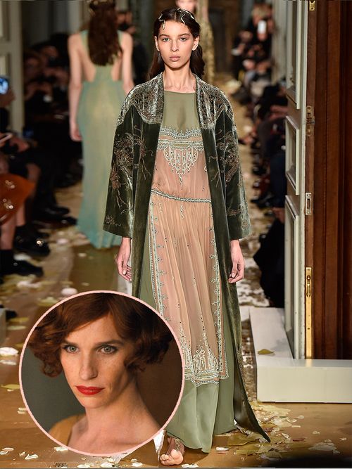 While we are sure that Eddie Redmayne in his usual snug suit will be amongst the sartorial highlights on Sunday night’s red carpet, we’d love to see him take one more spin as his character Lili Elbe. Knowing that her rusty brown hair and red lips pop against emerald green velvets, this couture Valentino gown would be right up her alley.