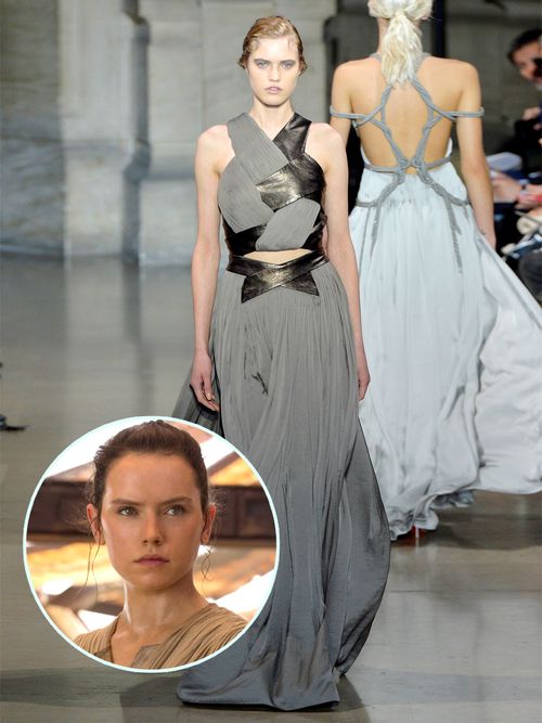 Fashions long love affair with Star Wars was reignited this year with The Force Awakens, thanks in large part to the series newest heroine, Rey, and her minimalist-meets-otherworldy style. And while we know that the actress playing Ray, Daisy Ridley, is herself a style Jedhi, we can’t help but think Rey, with her trademark three bun updo, would rule the red carpet in this Yiqing Yin gown.