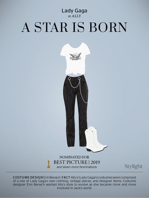 In Lady Gaga’s A Star is Born, costume designer Erin Benach sourced Ally’s outfits from a mixture of Lady Gaga’s own clothing, vintage finds, and custom-made designer pieces.