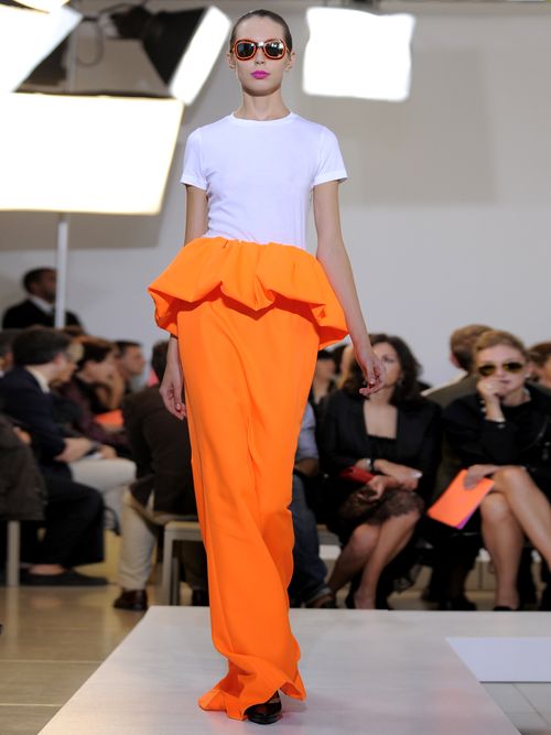 White is a bright hue’s best friend. Here, the white tee simultaneously turns up the volume on a tangerine while toning down the dressiness of peplum maxi skirt.