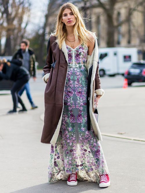 Maxi dresses are the perfect vessel for trying your hand at the bohemian trend. A shearling coat and Chuck Taylor's give this look an off-beat twist but anyone can tackle festival fashion by anchoring a maxi with the right accessories.