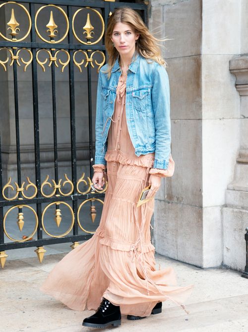 Even the most frilly dresses can be brought back to real life with the help of a few closet classics — in this case it's the ubiquitous jean jacket and lace-up boots.